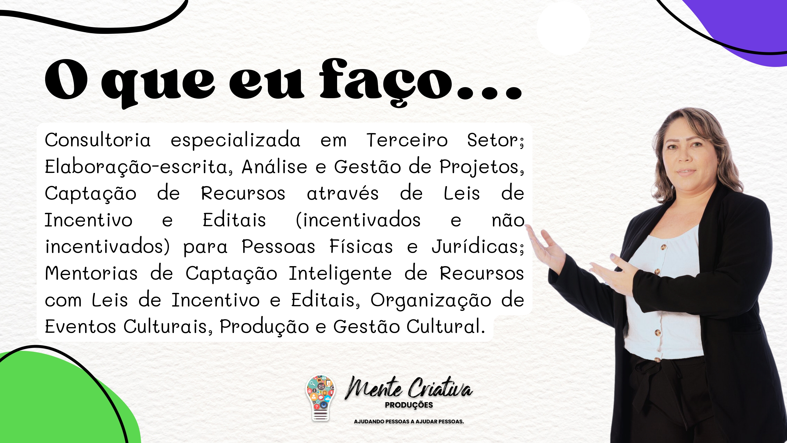 Turismóloga, Gestora de Projetos, Captadora de Recursos, Pesquisadora, Produtora e Gestora Cultural. Fundadora e CEO da Mente+Criativa Produções, Negócios e Projetos Sustentáveis LTDA. Pós-Graduanda em Política e Gestão Cultural pela Universidade Federal do Recôncavo da Bahia-UFRB_2028.1. MBA em Gestão de Projetos pela Escola Superior de Planejamento e Gestão-UNIESPG_2025.1. Graduada em Turismo e Hotelaria pela Universidade Estadual Vale do Acaraú-UVA_2010.> Especialista em Elaboração-escrita, Análise, Adequação, Adaptação, Gestão Estratégica e Prestação de Contas de Projetos de Impacto Sociais, Culturais, Esportivos, Socioambientais e Empreendedorismo Criativo.