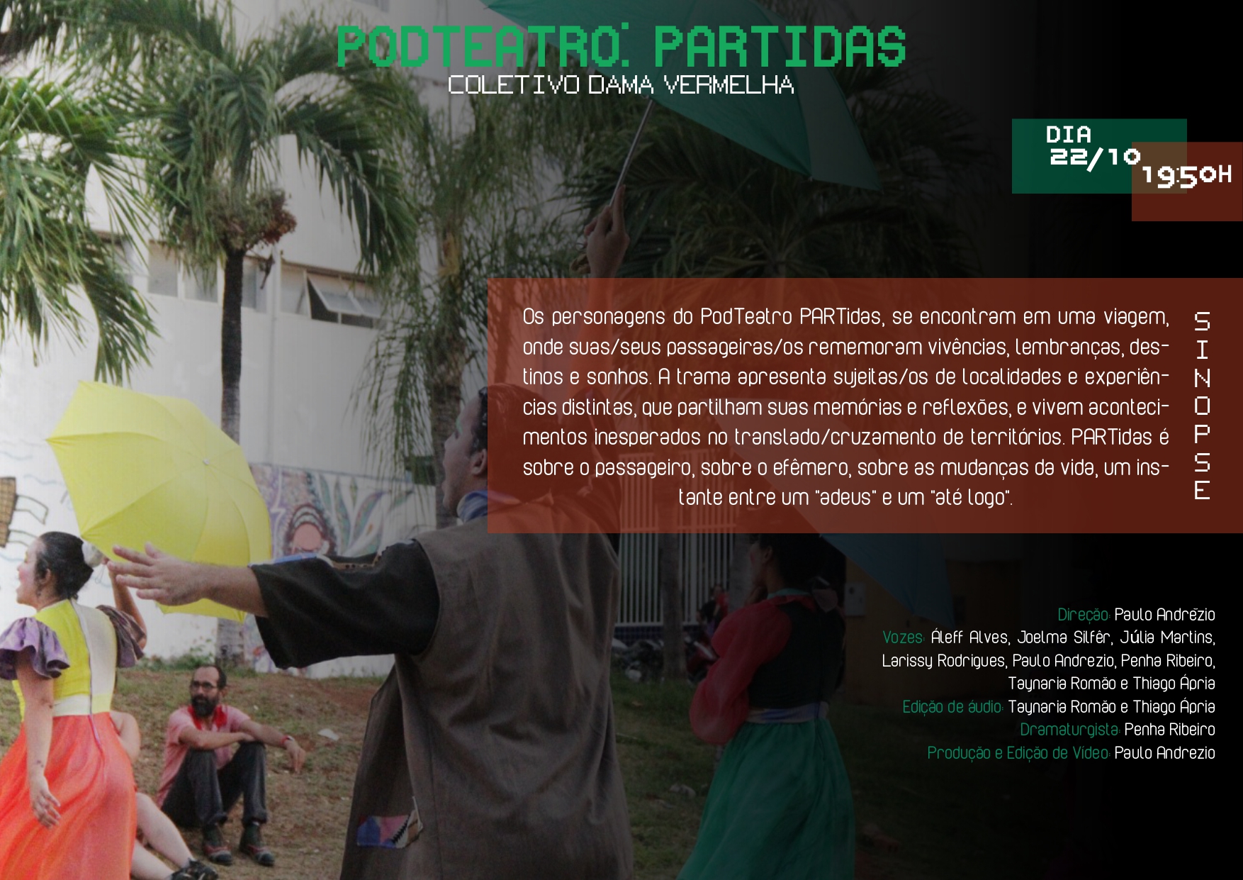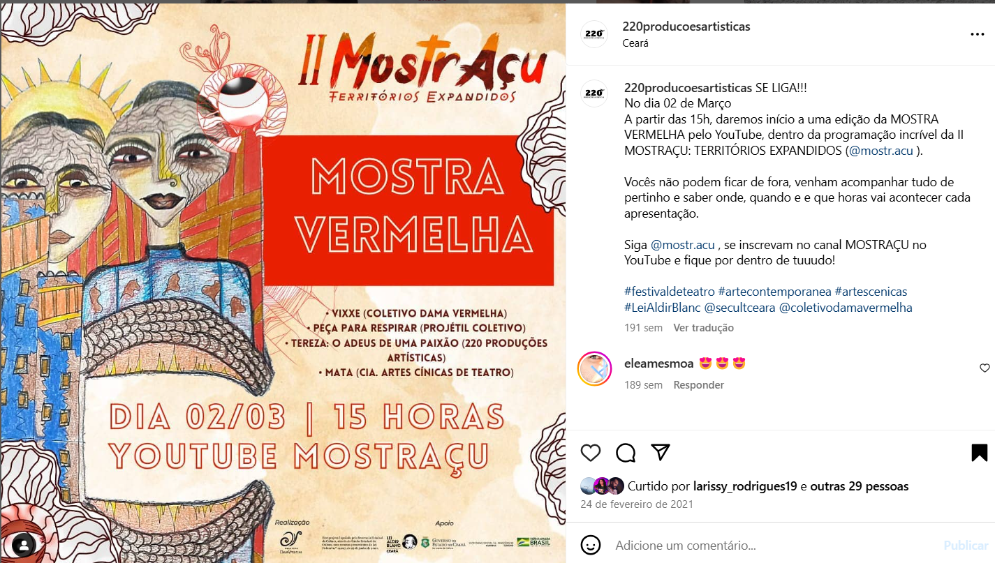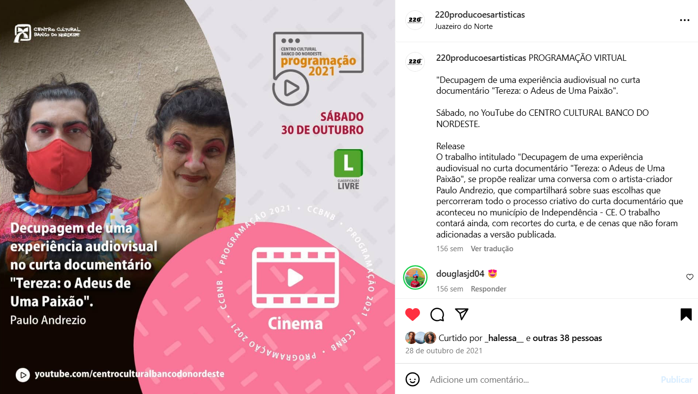 220 Produções Artísticas e Culturais atua desde 2018 na elaboração, gestão e execução de projetos culturais independentes e para editais públicos. Desenvolve produção e assessoria para artistas, grupos e coletivos, acompanhando criação, inscrição, execução e prestação de contas. Atua em teatro, cursos, educação, audiovisual, dança, cultura popular, eventos e políticas públicas no Ceará.