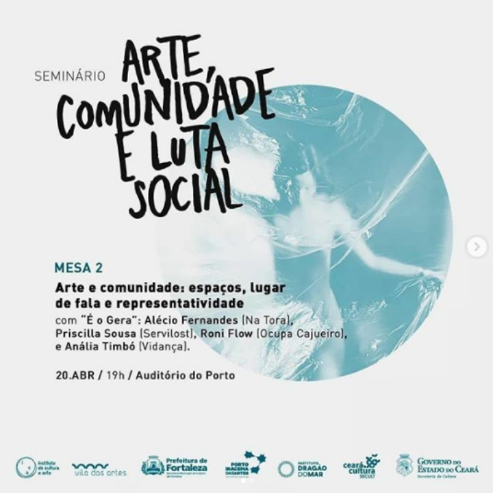 O "I Seminário Arte, Comunidade e Luta Social" foi uma parceria do Porto Iracema das Artes com o Curso de Licenciatura em Teatro da Universidade Federal do Ceará (UFC) e a Vila das Artes. A primeira discussão teve como tema “Arte com quem, para quem e como? Teatro, feminismo, comunidade e política” e abriu o evento. Ocorrendo no dia 19, às 19h, no auditório do Porto. No dia 20, também às 19h, ocorreu a segunda mesa “Arte e comunidade: espaços, lugar de fala e representatividade”. A presidente do Vidança Anália Timbó participou do segundo dia de debates.
